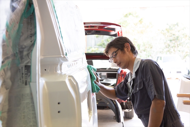 下塗りが完了したら本塗りにはいります。車の色によって何度か色を重ね、修理箇所とほかの部分の違いが出ないように丁寧にぬっていきます。